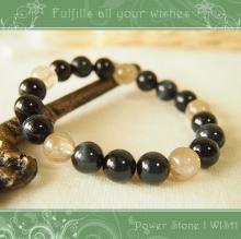 邪悪なパワーを跳ね返し、ひらめきと鋭いインスピレーションを与え目的達成の道を選択させるといわれるブルータイガーアイ、そして人・お金・人気運を呼び寄せ、とても強い厄除けのパワーをもつルチルクォーツ。