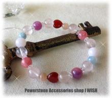 ルビーはモニターでは実際のお色目より少し明るく写っています。ご了承ください。カーネリアンはポイントでハート型のものを2つ入れました。淡いピンクの中にワンポイントで入ったアクアマリンの水色がとても可愛らしいブレスレットに仕上がっておりますし、愛情運、結婚運、魅力のパワーがとても強いブレスに仕上がっております。