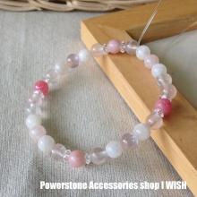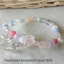 中央のリボンから時計回りに、爆裂水晶・ラベンダーアメジスト・インカローズ・水晶・ピンクカルセドニー・エンジェライト・ムーンストーン・ピンクカルセドニー・ブルートパーズ・マダガスカル産スターローズクォーツ・翡翠・マダガスカル産スターローズクォーツ・シトリンが入っております。(対面も同じ並び)