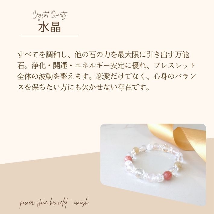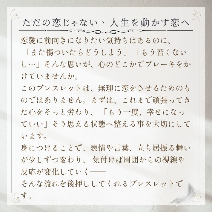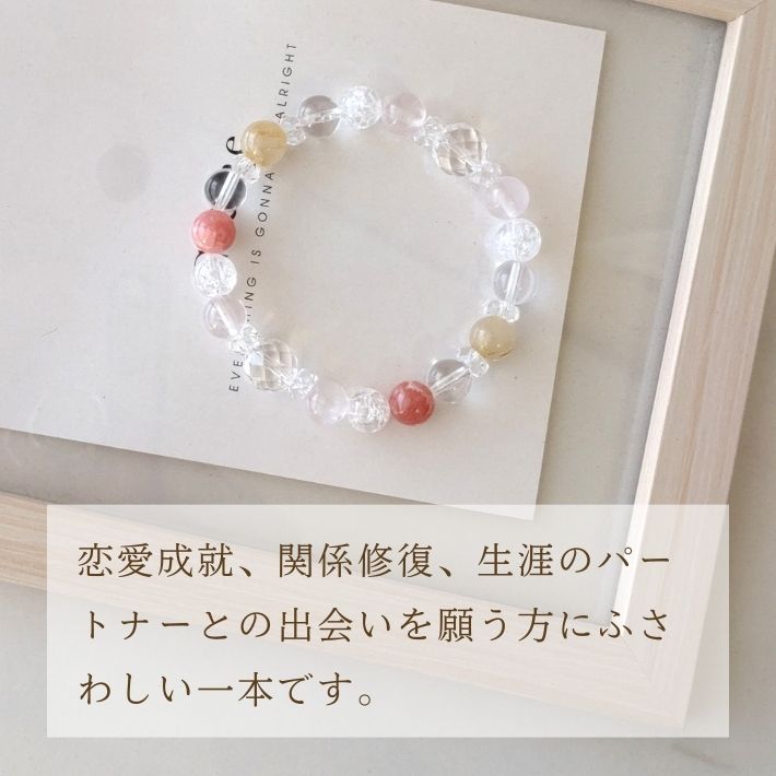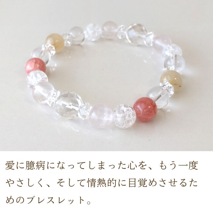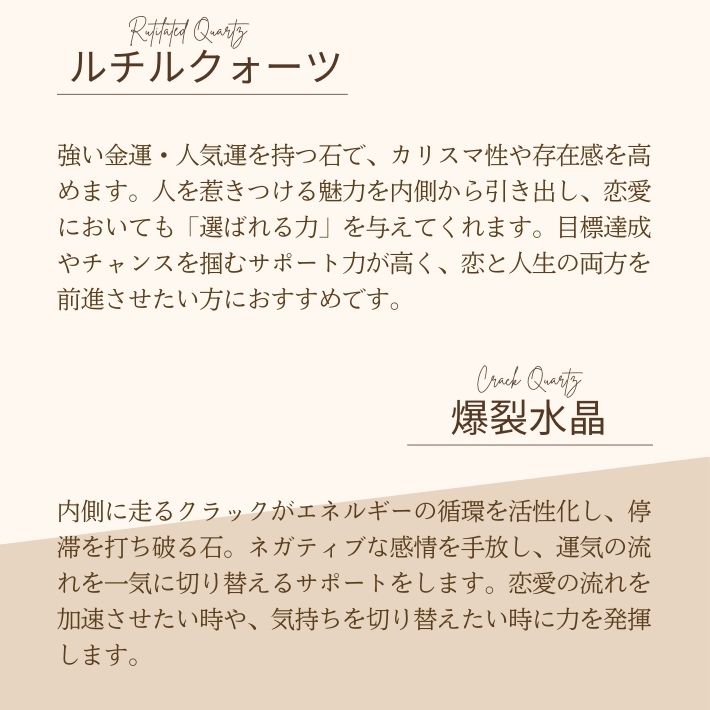 このブレスレットは、一時的な高揚感だけでなく、生涯のパートナーとの出会いや冷めかけた関係の修復など、深い愛の絆をテーマにしています。ローズクォーツが内面的な美しさを引き出し、ルチルクォーツが「ここぞ」という場面でのチャンスを掴み取る力を与えてくれます。