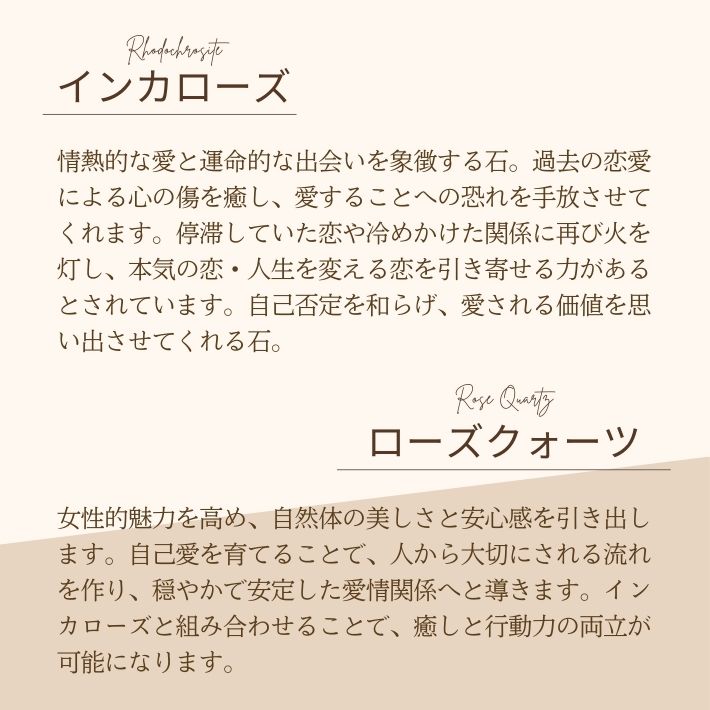 【検索キーワード】 パワーストーンブレスレット / 天然石 / 恋愛成就 / 復縁 / 運命の出会い / インカローズ / ローズクォーツ / ルチルクォーツ / 大人女子の習い事 / お守りアクセサリー / 人気運アップ / 婚活お守り