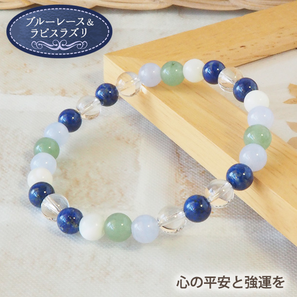 このブレスレットは優しいブルーレースをベースに、強運を呼び愛とお金の苦労をよばない&思わぬ幸運を呼ぶラピスラズリと、ツキとチャンスを呼ぶグリーンアベンチュリンを入れた