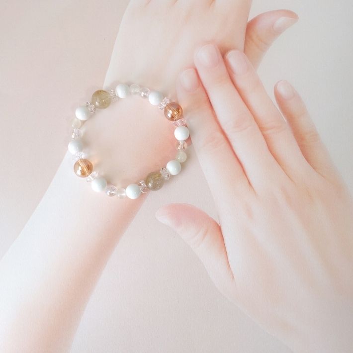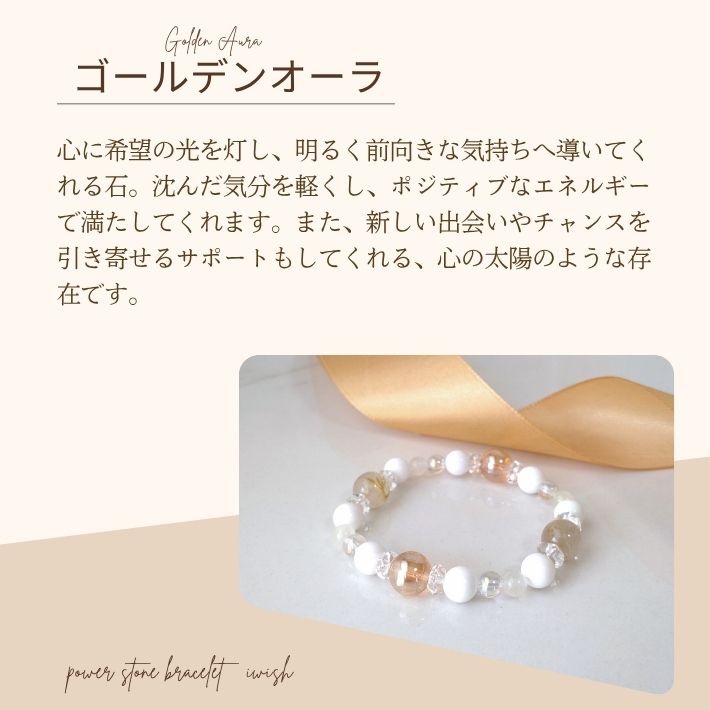 ( パワーストーン ブレスレット 天然石 / ゴールデンオーラ 10mm玉 ・ ルチルクォーツ 10mm玉 ・ ホワイト オニキス 8mm玉・アクアオーラ ホワイト 6mm玉・グリーン サーペンティン6mm玉 )