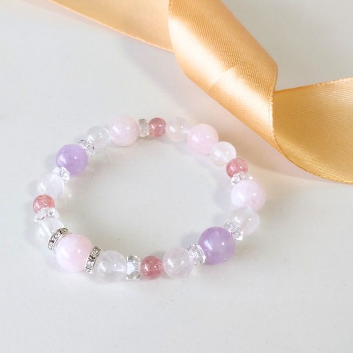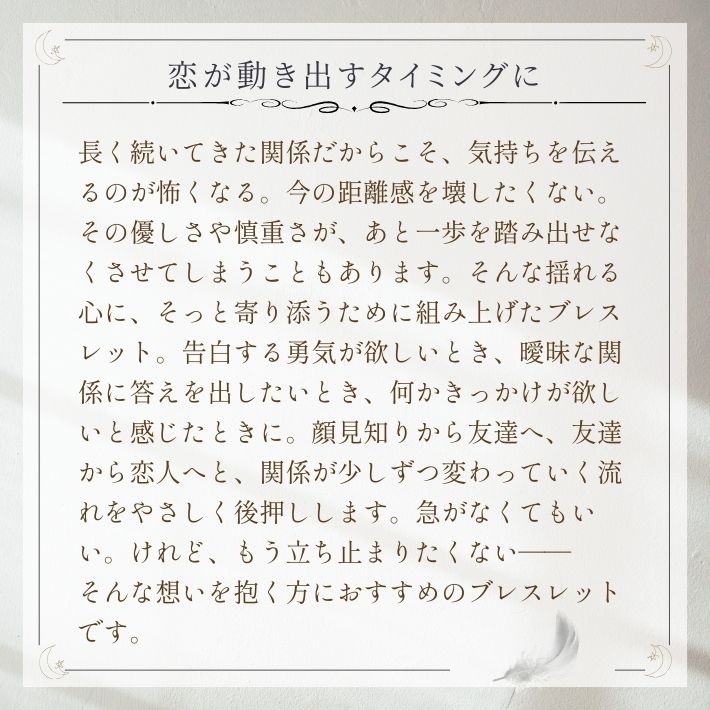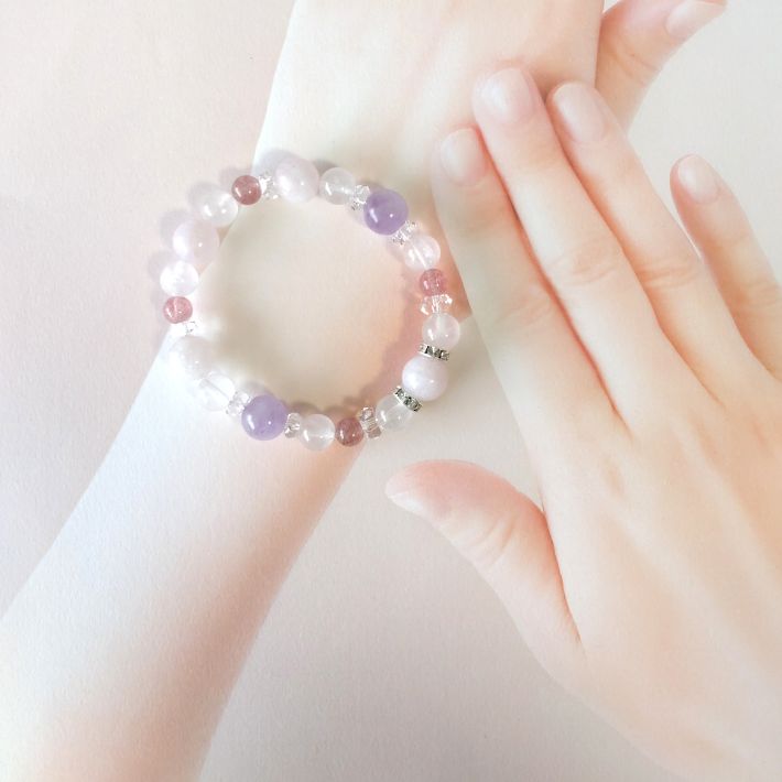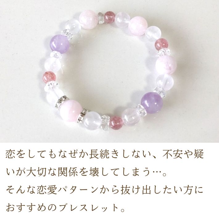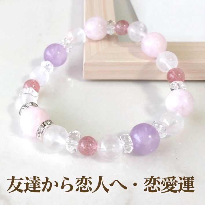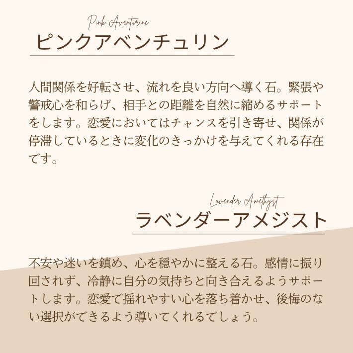 ピンクアベンチュリンとラベンダーアメジストの組み合わせが、緊張や警戒心を和らげ、二人の間の空気を好転させます。顔見知りから友達へ、友達から恋人へ……。急ぐ必要はありませんが、立ち止まったままの運気を動かし、関係性が少しずつ変化していく心地よい流れを作ります。