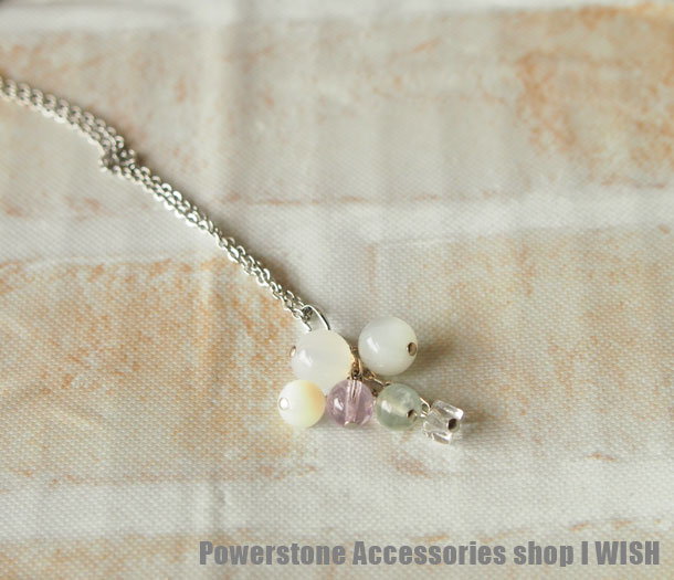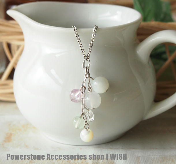 (パワーストーン(天然石) ネックレス/マザーオブパール6mm玉・ムーンストーン8mm玉・ホワイトカルセドニー8mm玉・クンツァイト6mm玉・プレナイト6mm玉・キューブ水晶)
