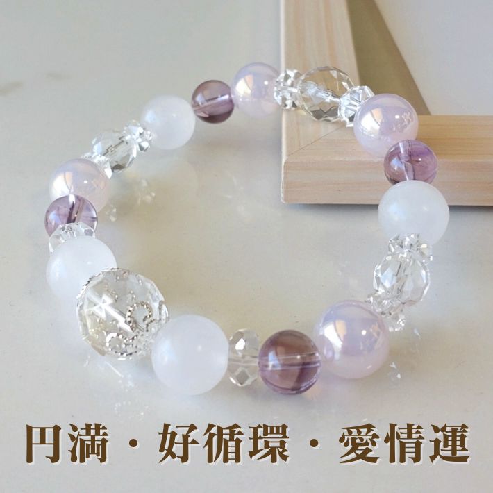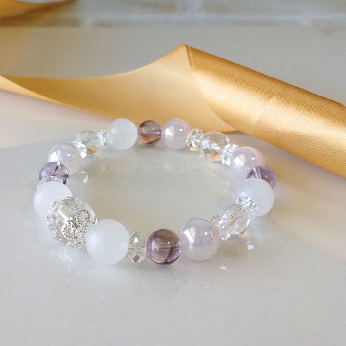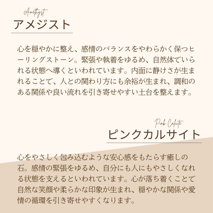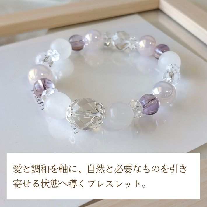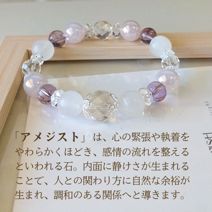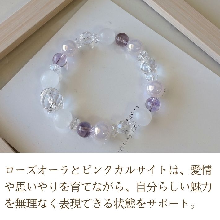 心の緊張を解きほぐし、愛と調和のエネルギーを整えることで、理想的な人間関係や幸運の引き寄せをサポートするヒーリングブレスレットです。高貴なアメジストと、愛を育むピンクカルサイト、魅力を引き出すローズオーラを組み合わせ、あなたの日常に穏やかな好循環をもたらします。