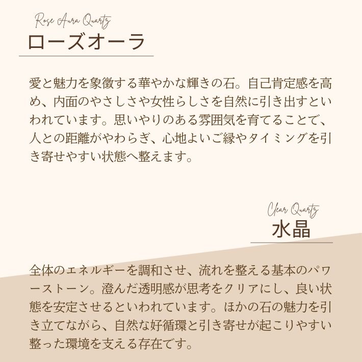 ピンクカルサイトとローズオーラは、自己肯定感を高め、あなた本来のやさしさを引き出す石です。心が満たされ、表情や言葉が柔らかくなることで、周囲からの反応もポジティブに変化します。愛し、愛されるという「愛情の循環」が自然に動き出すのを感じられるでしょう。