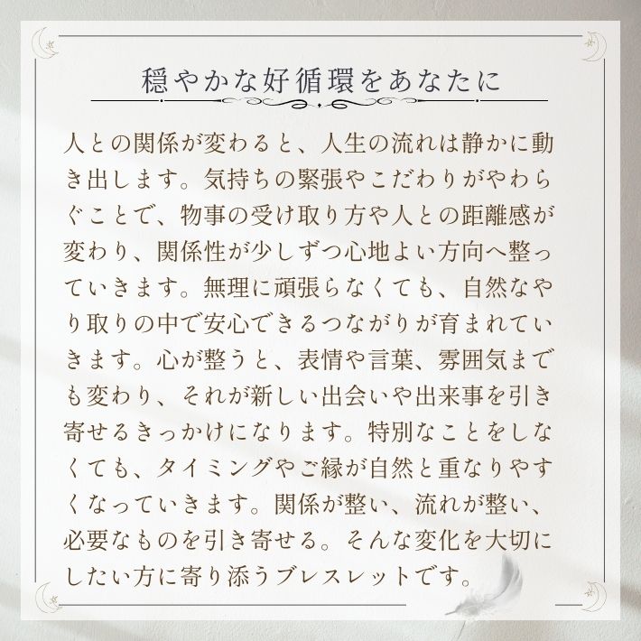 物事がスムーズに進まないときは、運気の停滞が原因かもしれません。このブレスレットは、水晶が全体のエネルギーを浄化し、流れをクリアに整えます。思考がスッキリすることで、必要なタイミングで必要なご縁が舞い込む「引き寄せ体質」へと導きます。
