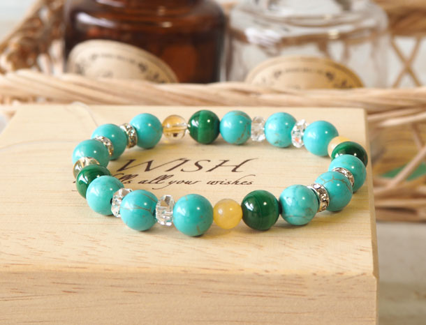 (パワーストーン ブレスレット (天然石)/マグネサイトターコイズ8mm玉・マラカイト8mm玉・カルサイト6mm玉・シトリン6mm玉・カットそろばん・ロンデル)
