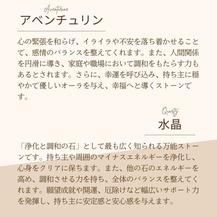 コメント | I WISHのブレスレットは既製品ではございません。ご注文をいただいてからご注文者様のために心をこめて丁寧にお仕立てをしております。 |