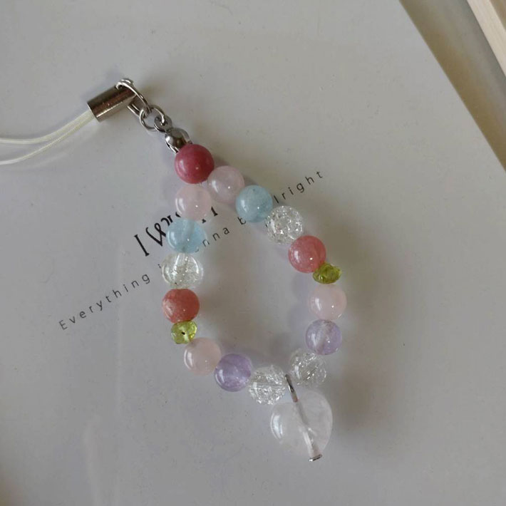 ハート型ローズクォーツとペリドットのさざれを補充してストラップひもを交換いたしました。