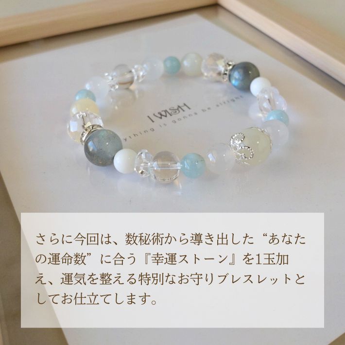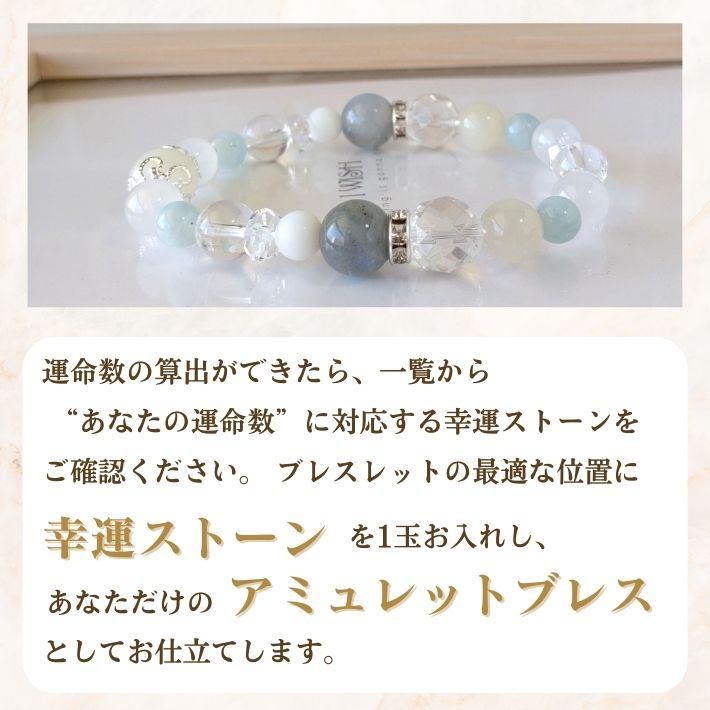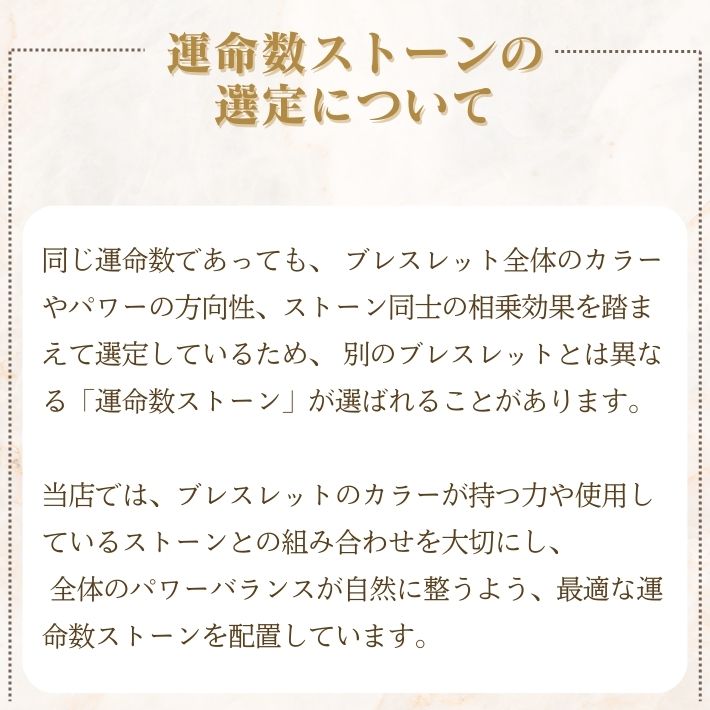 本ブレスレットは、パワーストーン専門店としての知見を活かし、あなたの生年月日から導き出す「運命数」に合わせた守護石を組み込む、世界に一つだけの鑑定ブレスレットです。