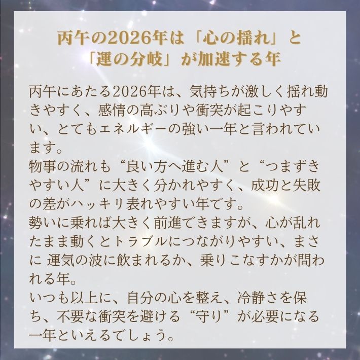 2026年は丙午(ひのえうま)にあたり、火のエネルギーが非常に強く、感情の揺れや環境の変化が加速する「運の分岐点」と言われています。