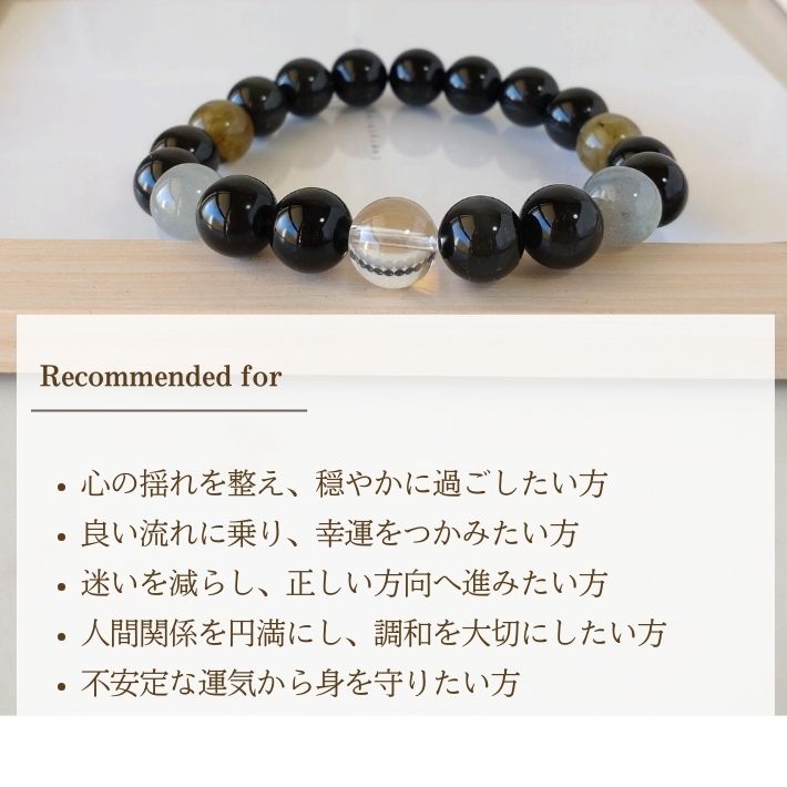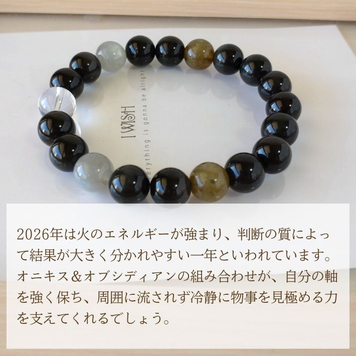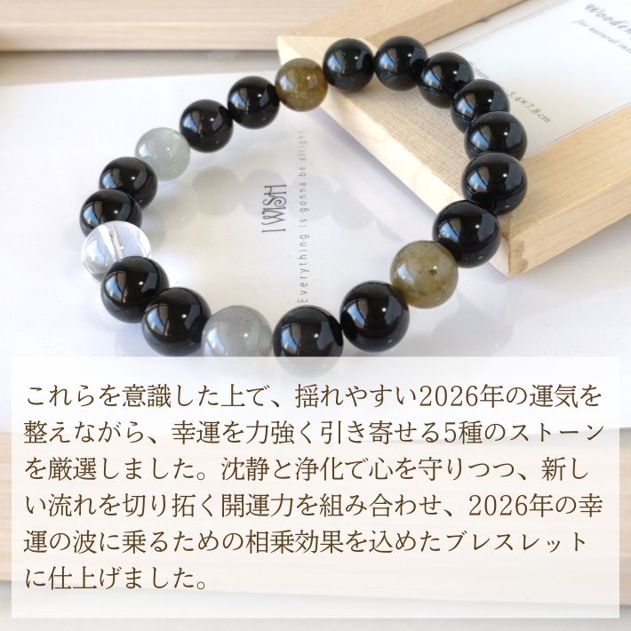 丙午の年は、周囲の影響や情報に振り回されやすく、感情的な判断がトラブルにつながることも少なくありません。2026年の開運には「見極める力」「不要なものを遠ざける守り」「正しい決断」がこれまで以上に重要になります。このブレスレットは、沈静と浄化で心を守りつつ、新しい流れを切り拓く開運力を組み合わせ、2026年の幸運の波に乗るための相乗効果を込めています。