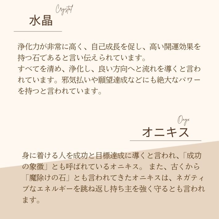- オニキス:成功の象徴。ネガティブなエネルギーを跳ね返し、持ち主を強く守る魔除けの石。