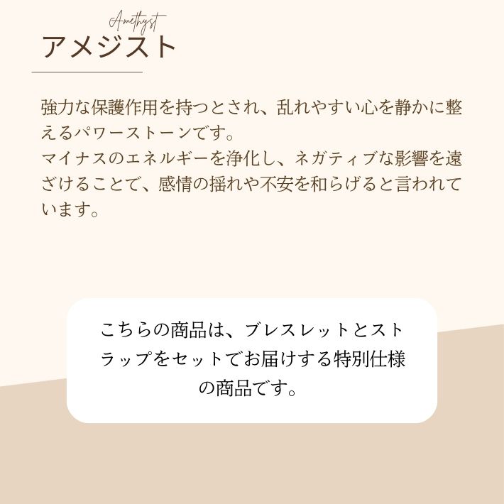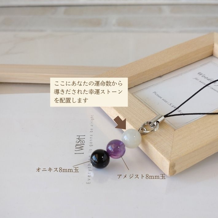 - ストラップ構成:オニキス(8mm)、アメジスト(8mm)、運命数別の鑑定石(8mm)