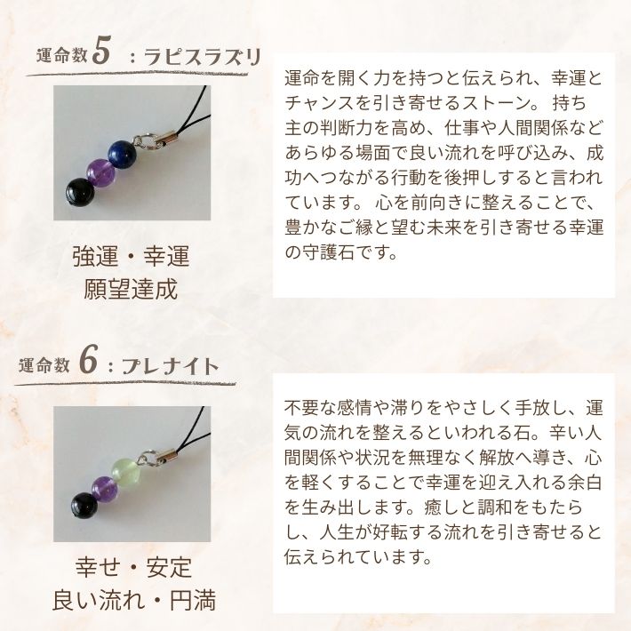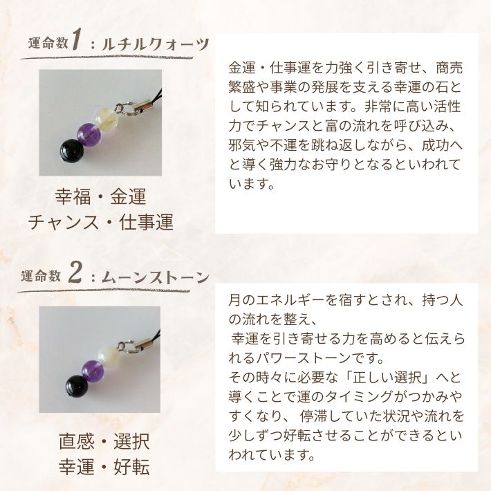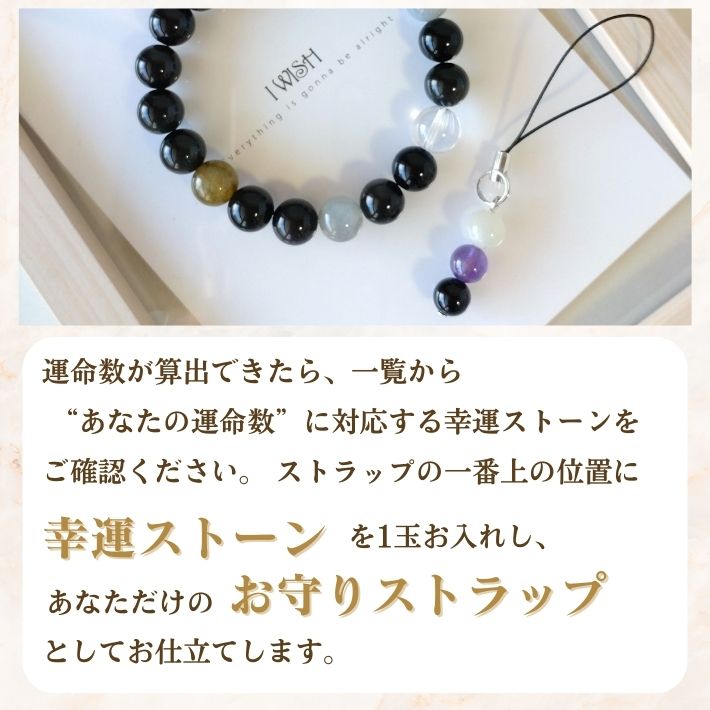 専門店として、お客様の生年月日から運命数を算出し、その方に合う「幸運の1玉」をお入れします。ストラップの一番上の位置に幸運ストーンを配置し、あなただけのお守りとして仕立てます。