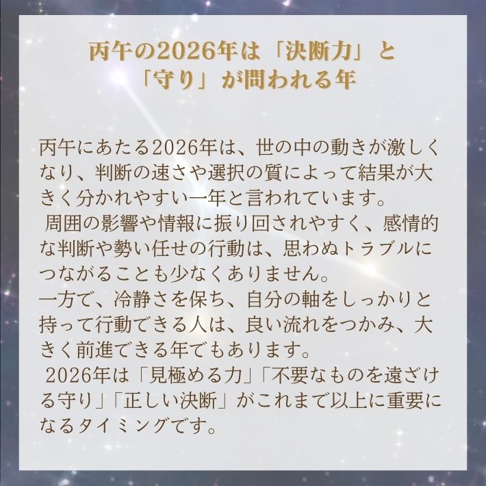2026年は、60年に一度の「丙午(ひのえうま)」にあたります。火のエネルギーが非常に強まり、世の中の動きが激しくなるこの年は、判断の速さや選択の質によって結果が大きく分かれやすい一年です。