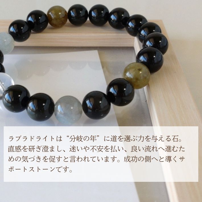 - ブレスレット構成:水晶(10mm)、オブシディアン(10mm)、ラブラドライト(10mm)