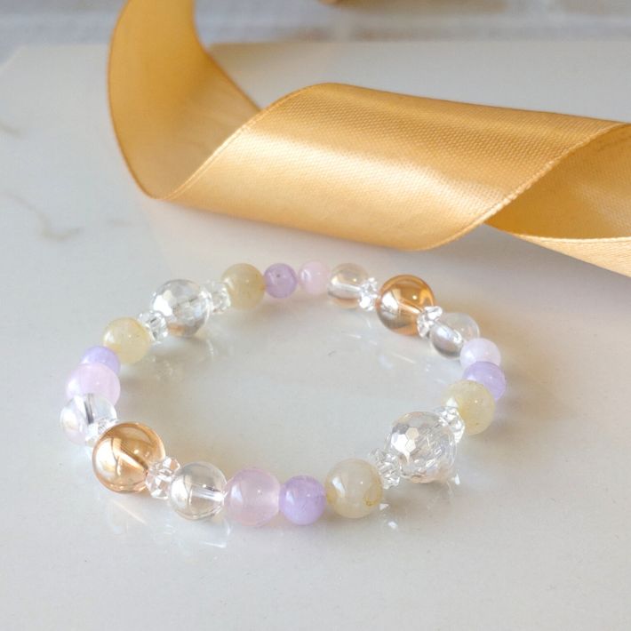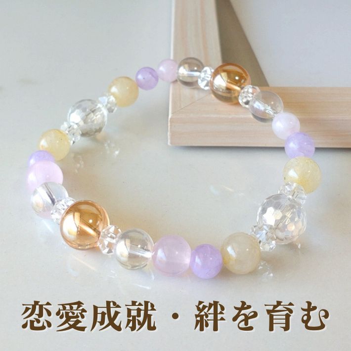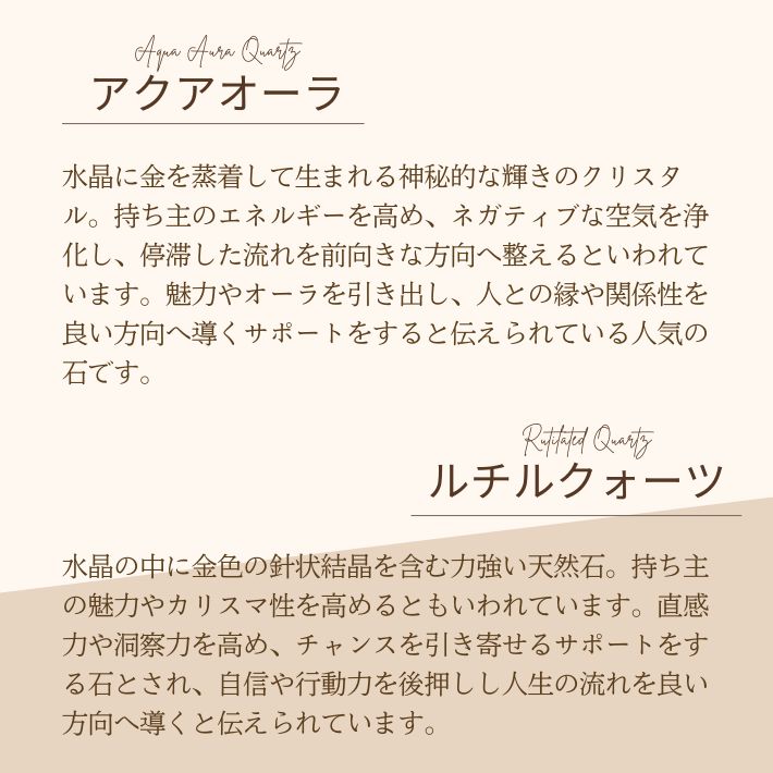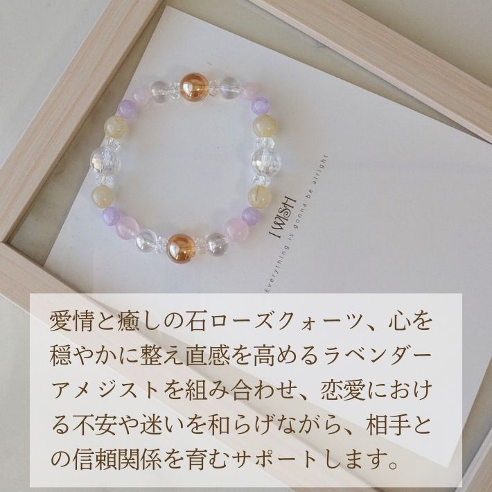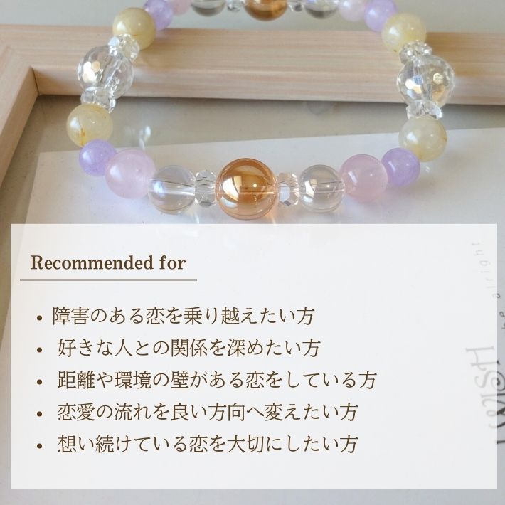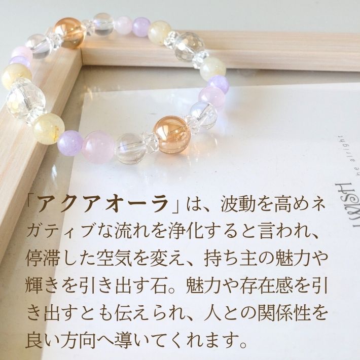 距離や環境、タイミングの違いなど、障害のある恋に立ち向かう方を支えるためにデザインされた恋愛成就ブレスレットです。ネガティブな流れを浄化するアクアオーラと、愛と癒しのローズクォーツ、そしてチャンスを掴むルチルクォーツを組み合わせ、停滞した関係性を前向きな未来へと導きます。