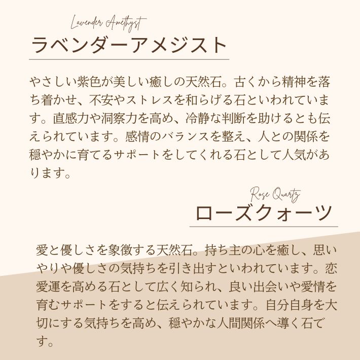 ラベンダーアメジストとローズクォーツの組み合わせは、恋愛における心の特効薬です。焦りや嫉妬、不安といった感情の波を穏やかに静め、自分自身を大切にする心を育みます。心が整うことで、相手との信頼関係を長期的に、そして深く築いていくための「精神的なゆとり」をもたらします。