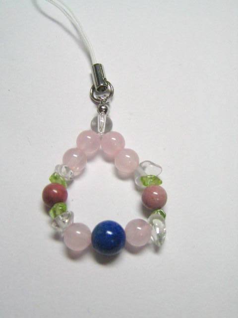 カワイイ感じのストラップをとのことでしたので、ピンク系でお仕立ていたしました。トップにはNN様の生まれ年のラピスラズリを配置いたしました。とても強いパワーをもったストラップになっていると思います。同じピンクなので、わかりにくいかと思いますが、緑のペリドットに囲まれた石はモッカイトで過去に交流のあった人との再交流をもたらす運気を呼んでくれます!緑のペリドットもNN様の守護石の一つで効果としては人間関係を円満にしたり、どんなに込み入った問題もスムーズに解決する力をもっています。明るい未来へと導く石です。色々な事情からNN様から別れを告げられたとのことですが、また復縁するキッカケを与えてくれるパワーをもつストラップにお仕立ていたしまております。