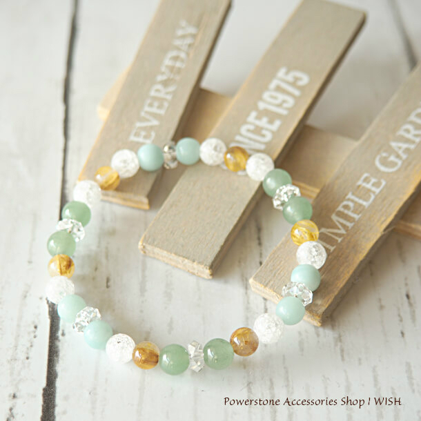 ( パワーストーン ブレスレット 天然石 / グリーン アベンチュリン 6mm玉 ・ ルチル クォーツ 6mm玉 ・ ホワイト カルセドニー 6mm玉 ・ 爆裂 水晶 6mm玉 ・ カットそろばん )