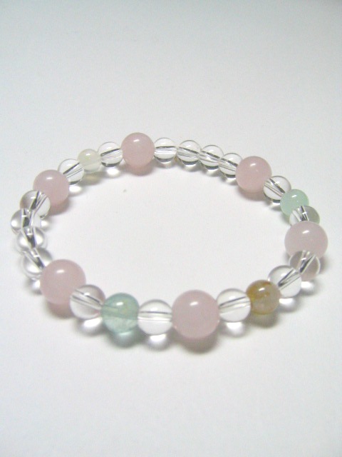 彼のブレスとのお色目違いでデザインいたしました。女性らしいデザインになるように6ミリ玉と8ミリ玉のランダムなデザインにしております。愛を呼び愛を育むパワーを与えるローズクォーツを8ミリ玉で大きくし、水晶をベースにその中に彼の守護石のクリソプレイス、ARK様の守護石のムーンストーン、大きな金運を呼ぶ金針ルチルクォーツ、幸せな結婚へと導くアクアマリンをお入れしております。彼のブレスはクールで男性的なのに比べARK様のブレスはクリア感がありとてもキレイなブレスに仕上がっております。