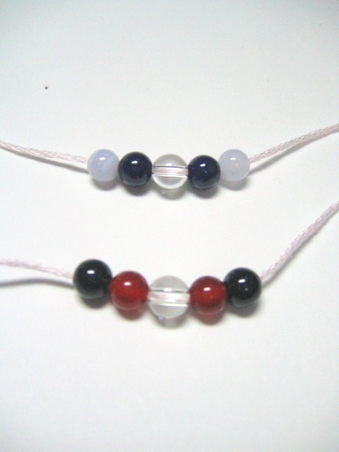 ブレスの方はブルーに赤を入れるととてもきつい印象のブレスになってしまうので、カーネリアンはオレンジを使用しましたが、ミサンガの方には赤いカーネリアンを使用しました。オレンジも良いのですが、赤にはよりやる気と活力、生命力を強くさせるパワーがありますので、ミサンガなら目立たないので赤を入れました。もう一つの学習運上昇のお石のトルマリンは持ち主の能力を磨き、外部からのネガティブな波動から守ってくれます。水晶は持ち主の身を守り、万能のパワーを発揮してくれるとても強いお石ですので、どちらのミサンガにもお入れしております。もう一つのミサンガは守護石のラピスラズリで学習運と強運を呼ぶように、ブルーレースアゲートで心の安らぎとリッラックスをもたらすことができるように構成しております。