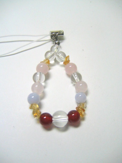 こちらのストラップは活力と健康、そして幸運を呼び込めるようにと構成いたしました。仕事運に良いとでておりましたカーネリアンは淡い系のお色でブレスを統一したかったので、ストラップに入れさせていただきました。仕事面だけでなく、何か目標をもってがんばりたいときなどにパワーを与えてくれます。シトリンは今回はさざれをお使いしました。カーネリアンの活力を与えるパワーとの相乗効果で明日に向けての明るい希望を与えてくれます。財運、金運にも恵まれるお石です^^